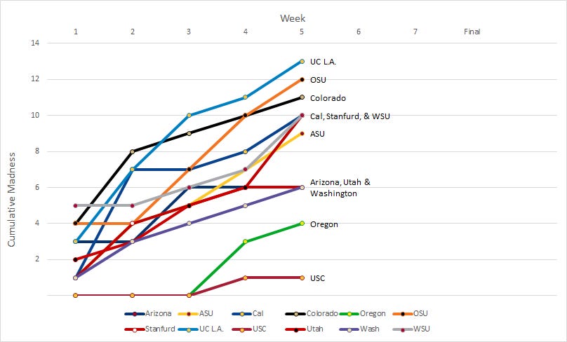 Nick Kranz (12): 0–4—and only one of those games was close. To the extent that anything about the Pac-12 this year can be said with confidence, I am confident that Arizona is quite bad.