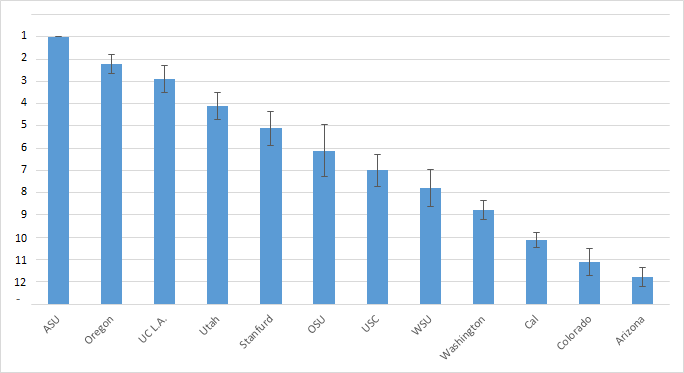 But for a little bonus layer of information, we can take a look at the precise scores that each team earned in our rankings. The precise averaged ranks are shown in the bars of Figure 3. The error bars represent the standard deviation for the team—or how disparate our votes were. With the exception of the ASU agreement, the standard deviations for the teams are fairly consistent, so we didn’t have any massive disagreement.