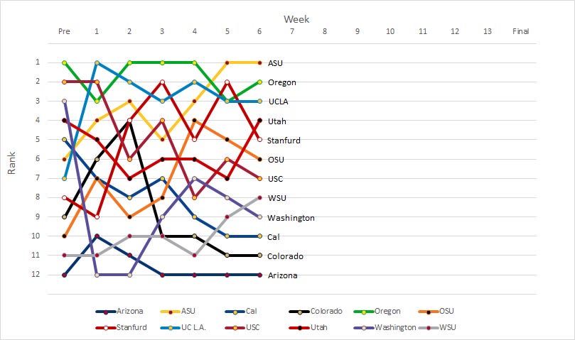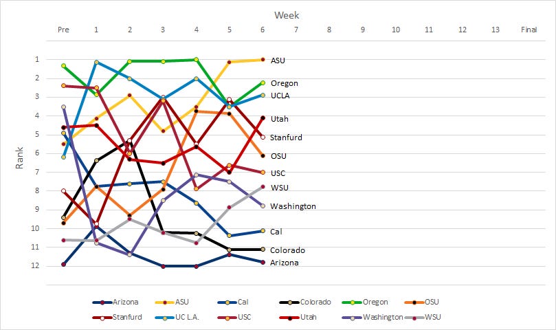 But while all of this Week 6 information is cool and all, who’s interested in learning a little more about the season overall? Our weekly rankings are collected in Figure 1 to give you an idea of how the teams have been performing all year.