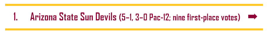 Berkelium97 (1): This might be the most complete team in the conference. Oregon has more talent, but ASU seems like a better coached team. The passing game is explosive, the run game is nigh unstoppable, and the defense is absurdly proficient at forcing turnovers and harassing QBs. I guess there might be some concern about the pass defense after LSJU completed 20-yard lobs to TEs over and over, but they don’t face many proficient passers over the remainder of the schedule.