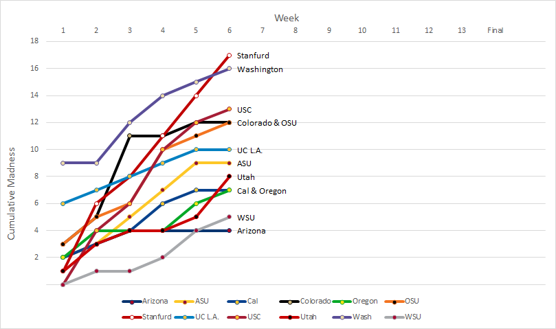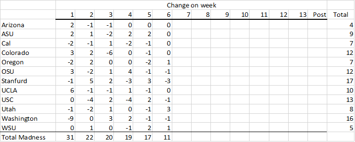 This is the first week of the year in which more than two teams held steady at their position—five, to be exact. Three of them are at the bottom of the conference because they’ve clearly earned their spots based on their performance. By pure coincidence, four of them happen to be the first four teams of the conference alphabetically. This is shown in Table 2, which sums how much the teams have moved up and down the ladder—a metric that we call the Madness. Table 2 also shows that each passing week has become less and less Mad (although I would certainly not expect this pattern to hold in the crazy world of the Pac-12).