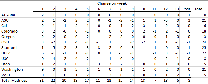 I’m pretty proud of how the Power Rankings have evolved over time, adding new features and getting refined to be a better product over time (hopefully). The addition of Madness is one of my favorites because that came from our own readers. The Madness metric tells you how many spaces up or down the teams moved; Table 2 shows the Madness each week and Figure 2 shows how the Total Madness for each team progressed as the the year crept on.
