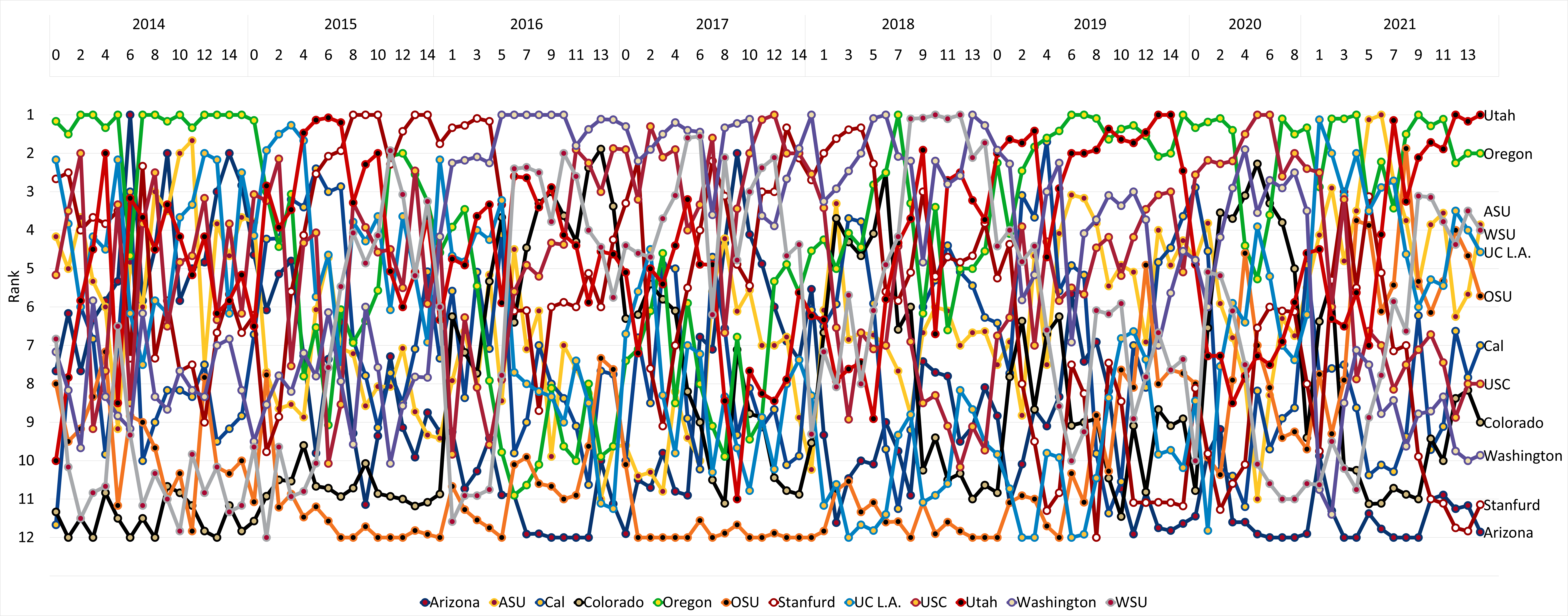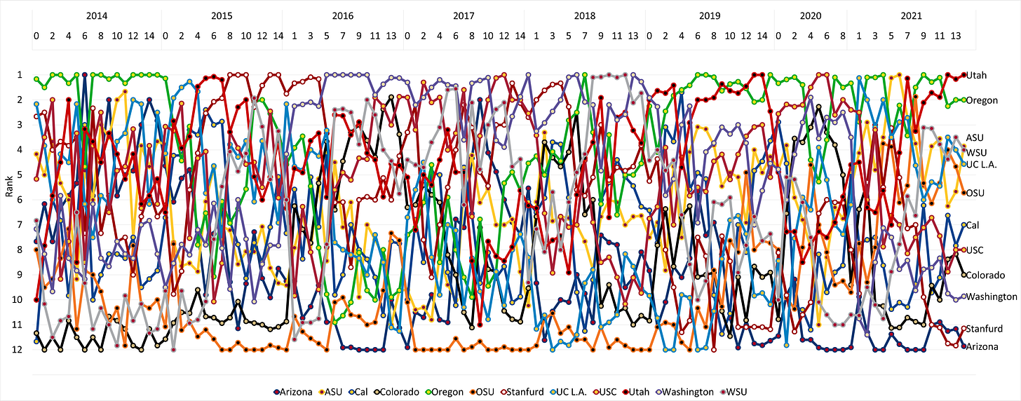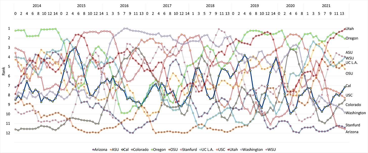 To make things a little more Cal-centric, Figure 9 is the pure precise rankings (i.e., not the rolling average), but just for the Bears. It’s tough to find any rhyme or reason to our performance… we tend to just yo-yo up and down. Notable exceptions include a strong start in 2015 (behind Jared Goff’s golden arm) and a potential Wilcox trend (in 2018 and 2019) of starting and ending the season strong to sandwich a midseason collapse.