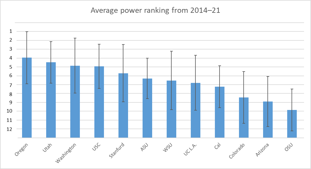 Figure 6 is a look at the average ranking that each team held for the past eight seasons. When you see that the top team—the Ducks—have an average score around 4, that tells you that every team struggled to some degree during this window and flirted with the lower-half of the conference at least. For the Ducks, that would be thanks to Mark Helfrich and the resulting rebuild. Staying with our northern neighbors, the team at the other end of the scale is Oregon State, who have just one winning season during this window—this past season. These years have been tough for the buck-toothed Beavers, who bore witness to the fall of Mike Riley and the false hope of Gary Andersen, with Jonathan Smith appearing to finally have the program on the right path again.