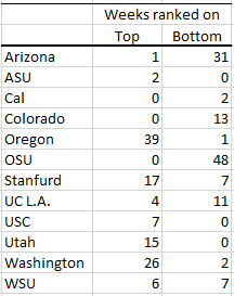 On the other end of the spectrum, we’ve agonized for two weeks at the bottom spot; if I had been running our Power Rankings in 2013 instead of ragnarok—and thus had easy access to that data—this figure would be far, far higher. Our Bizarro team is Arizona State, which has been our top team twice while never succumbing to the bottom.