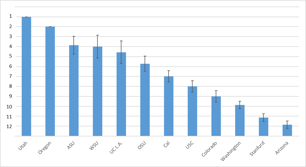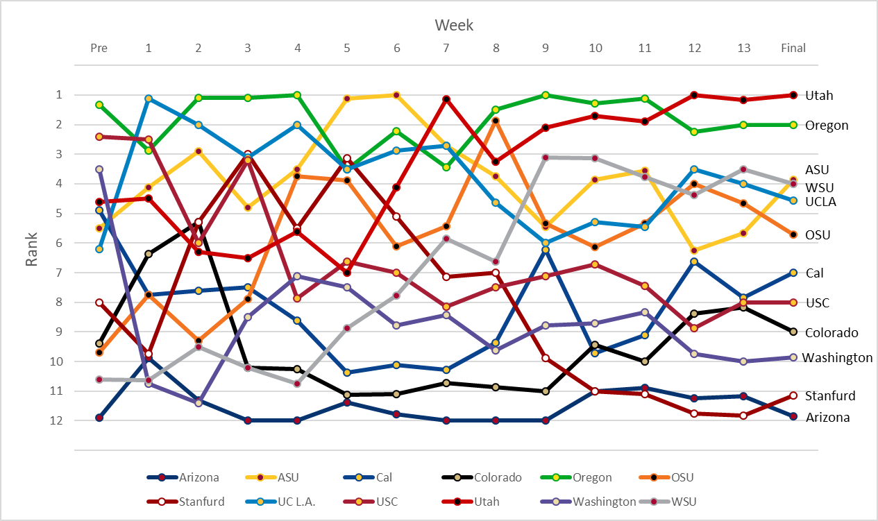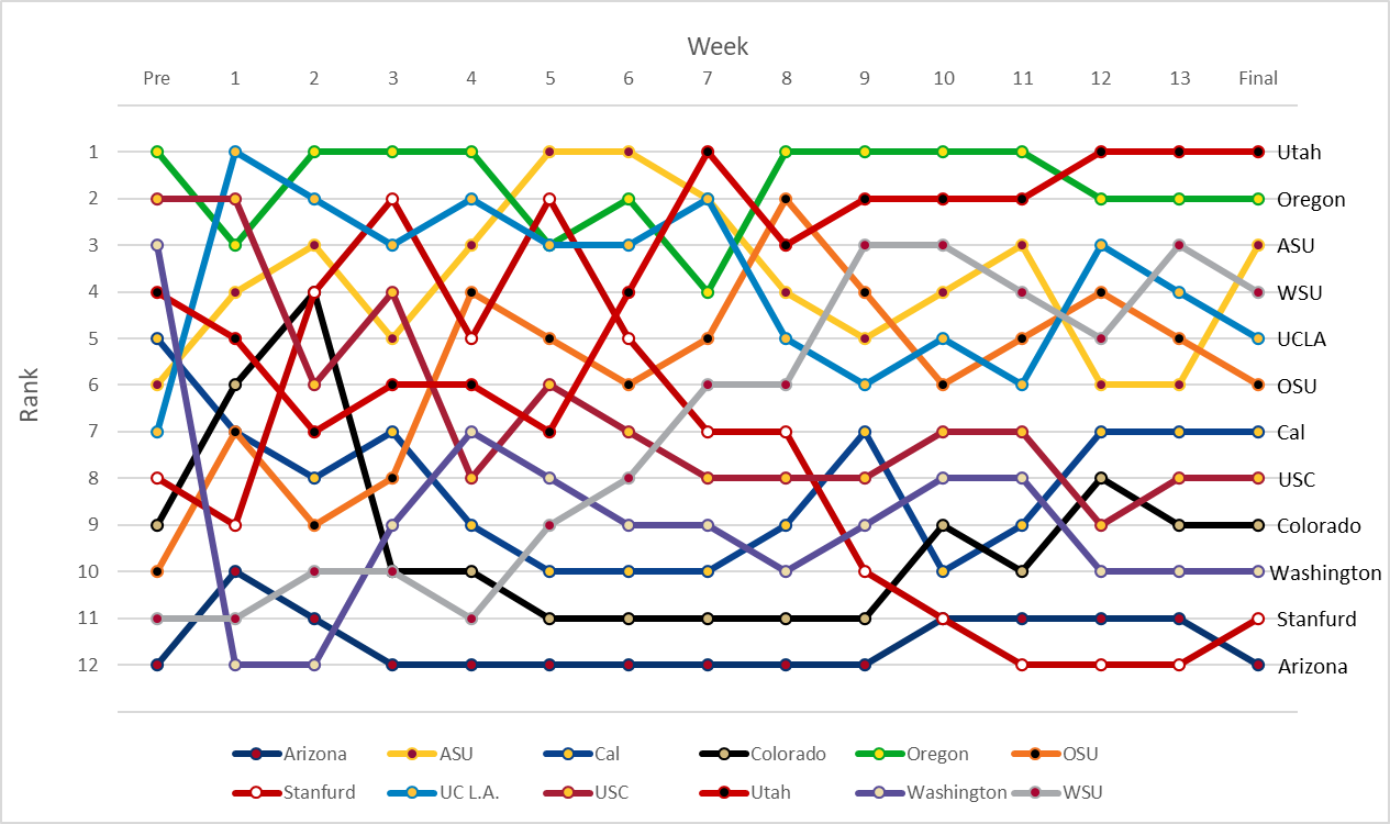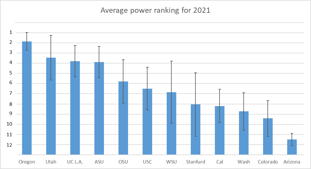 With the season complete, we can also take a look at some (potentially meaningless) data assessing the season as a whole. Namely, asking the question of what each team’s average ranking this whole season was. Figure 5 shows the score for each team when you average their votes all season long. Oregon has a commanding lead on the top spot—perhaps unfairly as they were exposed once their hit the Utah roadblock. Unsurprisingly, Arizona also has a decisive hold on the bottom spot for struggling all year. Despite earning a pretty clear failing grade, Stanfurd ranks relatively high thanks to some early-season heroics twice gave them second place in our rankings. I guess that no matter where you go, grade inflation is always there to boost those Furdies.