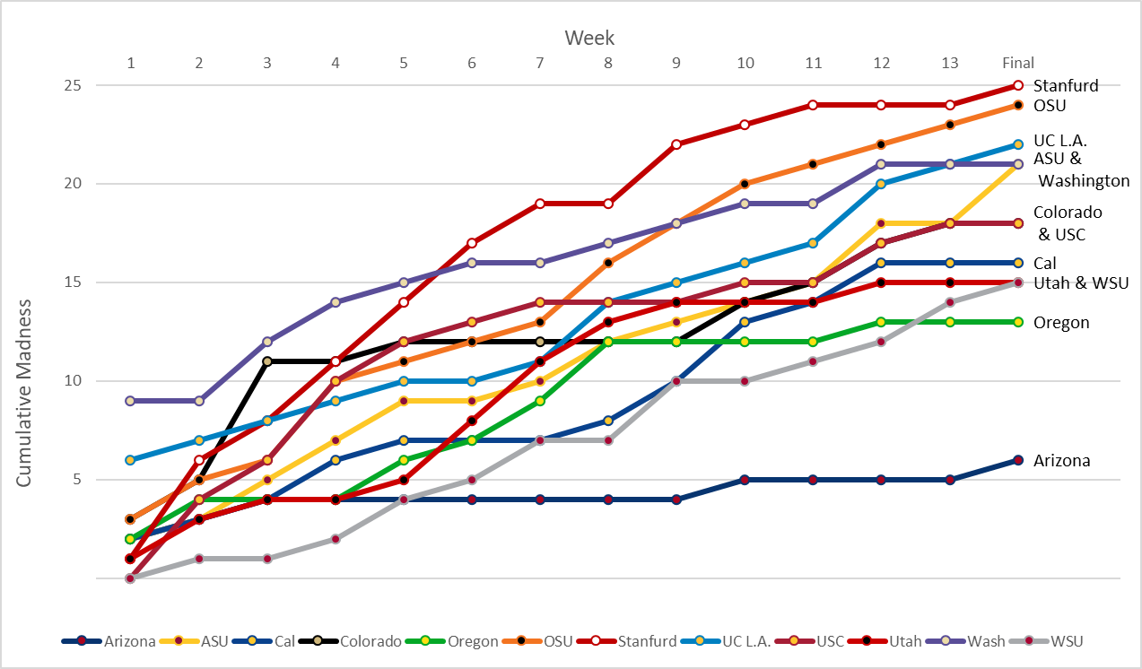 By virtue of struggling all year, Arizona was a shoo-in for Least Mad team of the conference—the only team with a Madness score in the single digits. The battle at the other end of the spectrum—for the title of the Maddest team—was a much closer contest. Stanfurd has been on top since Week 6, but their stability at the bottom of the conference coupled with Oregon State’s late-season struggles meant the latter was closing in—but Stanfurd rising one spot this week helped them lock things up.