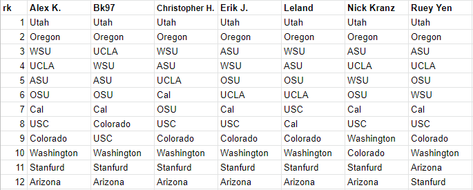 Nick Kranz (4): Maybe the best offense in the conference—and definitely the best QB/RB combo with DTR and Zach Charbonnet giving opponents fits. But the defense was still pretty bad and UCLA is losing more talent than maybe any other team in the conference. If the high point of the Chip Kelly era is 8–4 and embarrassing communication during a cancelled bowl game, I can’t imagine UCLA fans are super thrilled.
