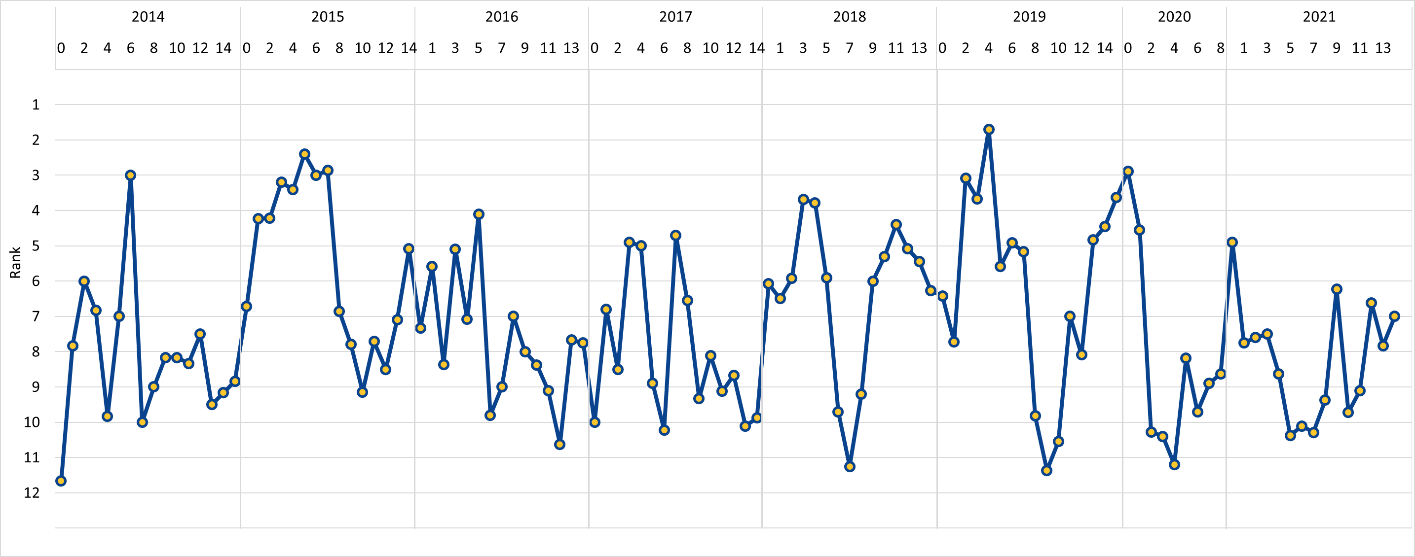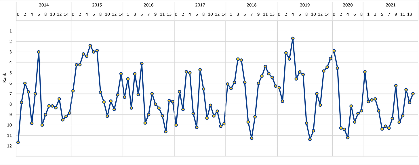 Our entire 2021 rankings are graphed in Figure 1. The Bears end the season ranked seventh and as the best sub-0.500 team in the conference. For eight weeks running, we have a split between the same six teams in the top half of the conference and the same six teams in the bottom half; a cursory scan through the past years that I’ve run our Power Rankings (starting 2014) shows the longest previous season-ending split lasted for six weeks, so this is a new record.