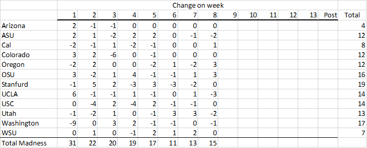 In case you don’t feel like counting how many spots those top teams moved in that shuffle, then I (well, Excel) happen to have that information nice and convenient for you in Table 2. Despite five teams not moving (and two teams just moving one spot apiece), the big movement at the top of the conference still resulted in more Madness than last week.