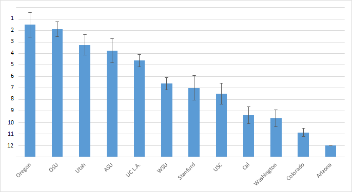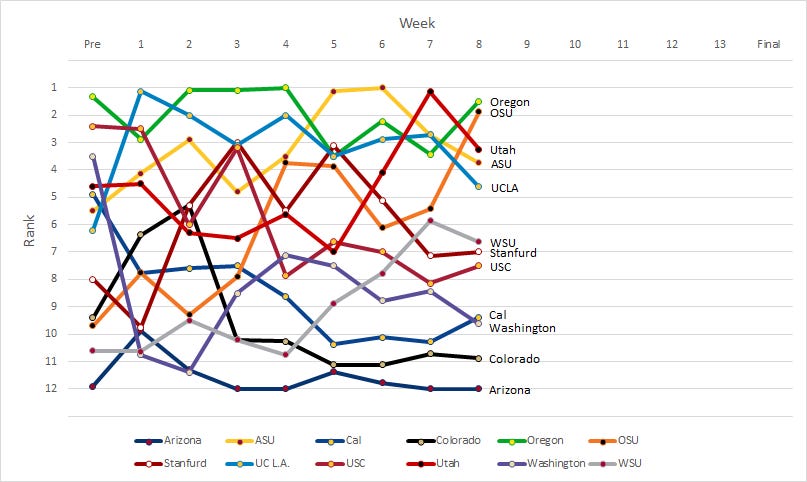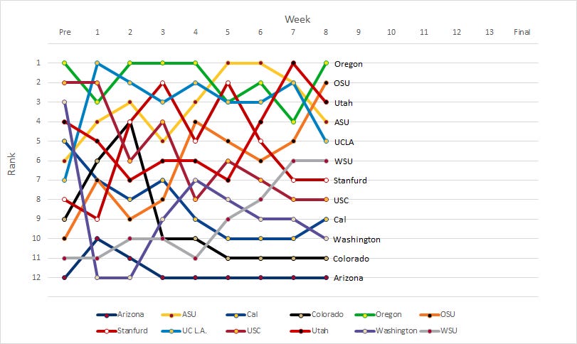 The precise scores (Figs. 3 and 4) and the precise calculations tend to lend themselves to little clusters when we—as a collective—did not have unanimous distinction or separation. This week, we have the two schools from Oregon up top after big wins over leading contenders in the South division. They’re followed up by a trio of the Utes, Sun Devils, and Baby Bears—three teams doing well and likely shoe-ins for bowl eligibility. There’s a big gap followed by the next grouping of three teams with a reasonable shot at a winning season, but some flaws and bad losses in their record (Wazzu, Stanfurd, and USC). And then, the lonely basement—a quartet of teams who are likely to be sitting cold and alone this December.
