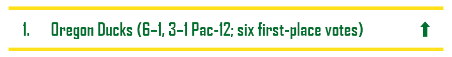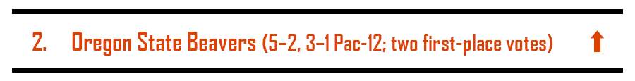 Berkelium97 (1): We’ve been doing these Pac-12 Power Rankings for the better part of a decade and this is the first time I’ve ranked OSU at the top. Welcome to #1, Beavs. They fell into a big hole against a tough Utah team, but blew up for nearly 300 second-half yards. Like Nick said, this is looking like the best offense in the Pac-12. If they don’t slip up in the next three games (@Cal, @Colorado, vs. LSJU), they will force the Civil War to become a battle for the Pac-12 North title.
