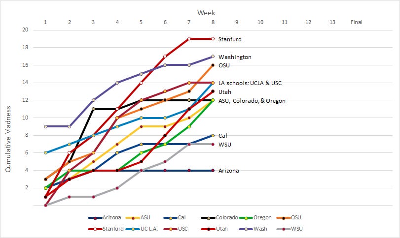 When we take a look at each team’s cumulative Madness scores at this point in the season, we see that WFC has brough unity down to SoCal with the two Los Angeles schools tied with a Madness score of 14 for the season.