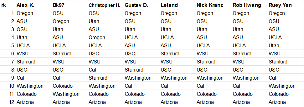 Evidently the Monopoly Man was born in the state of Oregon because they’ve got a stranglehold on the top of the conference. Six of our eight voters have the Ducks and the Beavers in their top two spaces (Table 1).