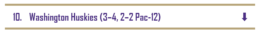 Nick Kranz (9): I seriously considered dropping UW below Cal for the crime of almost allowing Arizona to win a football game. And the performance was bad enough that UW fans may not be satisfied with just firing OC John Donovan—I suspect they want to see Jimmy Lake gone as well.