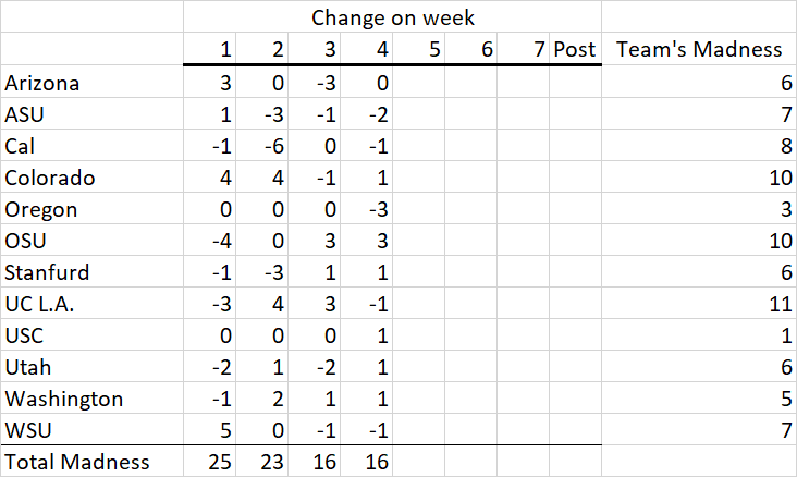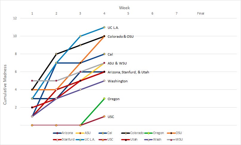 With Oregon’s fall from grace—and how that directly led to USC’s rise—we no longer have any teams holding the same position they started the season with. These movements up and down the conference are known here on WFC as the Madness and are shown in Figure 2A. Though this is tied as our least-Mad week of the season, it’s quite monumental for the aforementioned moves of the Trojans and Ducks. The cumulative Madness for each team is graphed for the season in Figure 2B. Despite typically being one of the Madder teams of the Pac-12, USC is uncharacteristically low on the Madness scale at this point—and now in sole possession of that title.
