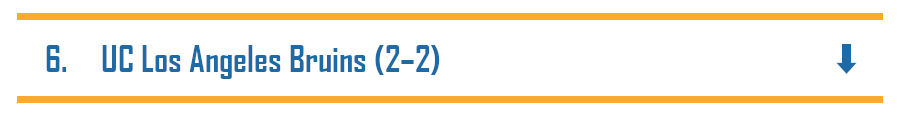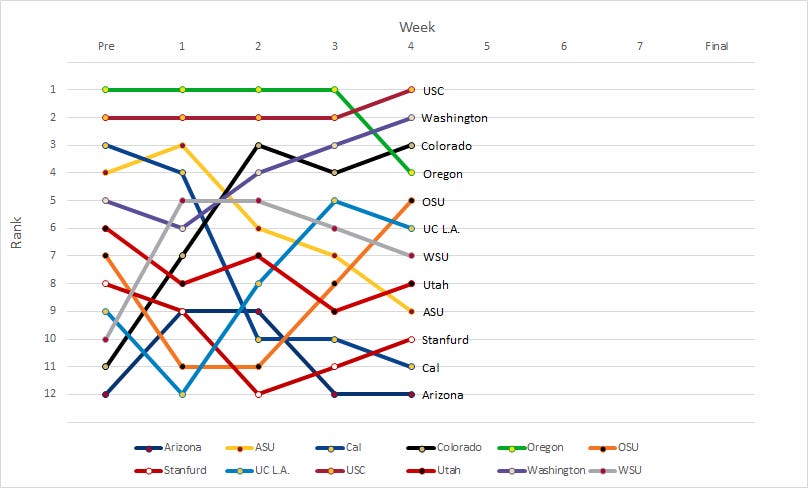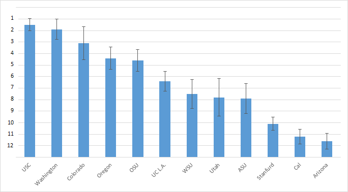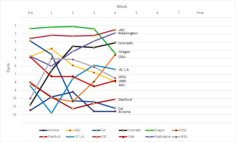 While some readers will undoubtedly question how we could have Oregon above Oregon State when the latter has the head-to-head victory, the precise ranks will hopefully in some small part relieve them—the Ducks are just barely above the Beavers. The bottom of the conference consists of the same trio as last week—Arizona and the Bay Area schools.