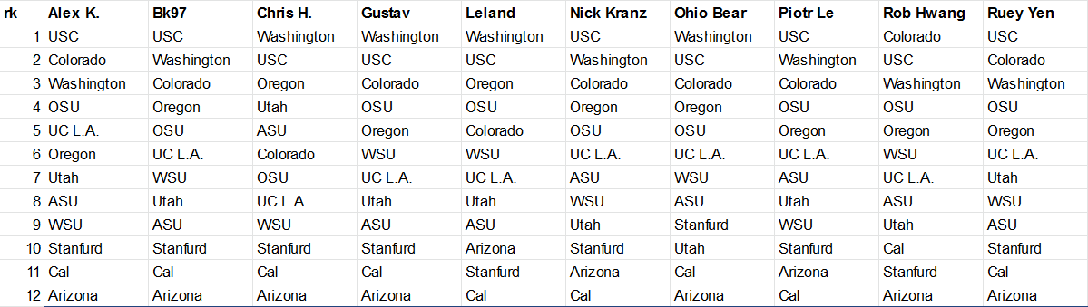 Nick Kranz (8): Not really sure what to do with the OSU > Oregon > Wazzu > OSU paradox. WSU goes eighth, I guess?