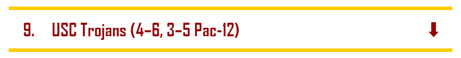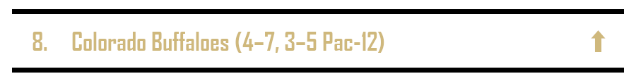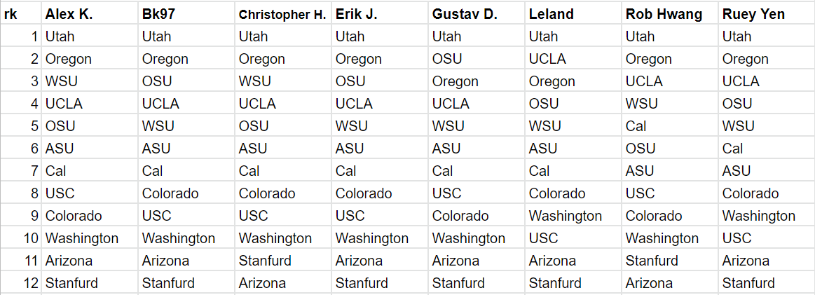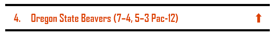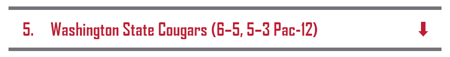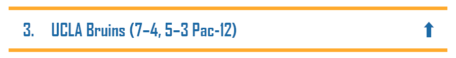 As we inch closer and closer to the grand finale, all I care about in these rankings is maintaining the half-and-half split in the conference. To do this, we have to avoid upsets in Pac-12 rivalries (the Apple-for-theSubstitute-Teachers Cup, the Territorial Cup, and Utah–Colorado) and hope that two of our in-state rivals lose in non-conference games against ranked teams.