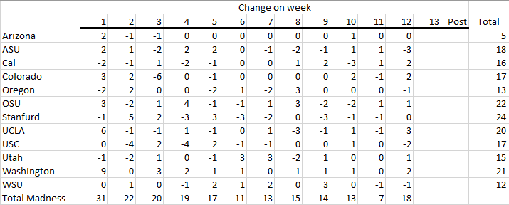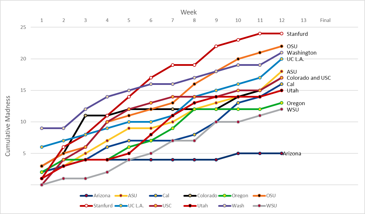 Arizona has a stranglehold on the title of least Mad team as a function of their basement-dwelling this year (Fig. 2). The actual basement team at the very, very bottom of our rankings is on the other end of the Madness spectrum—the lowly (literally and figuratively) Stanfurd Cardinal have been our Maddest team for seven weeks now, but Oregon State is closing in.