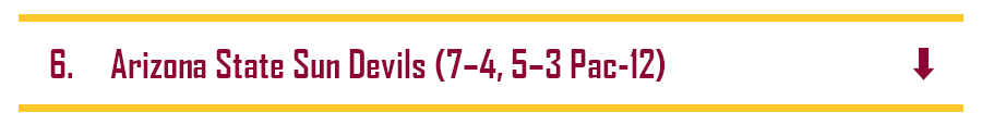 Berkelium97 (6): ASU has steadily fallen in my ballot for the last several weeks and they did more of the same things that have caused that decline: turnovers, loads of penalties, offensive inefficiency. The only reason they managed a single TD was because OSU gifted them the ball at the 4-yard-line. They should beat Arizona next week, but I wouldn’t be surprised if they lost.
