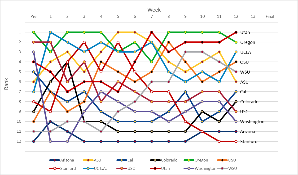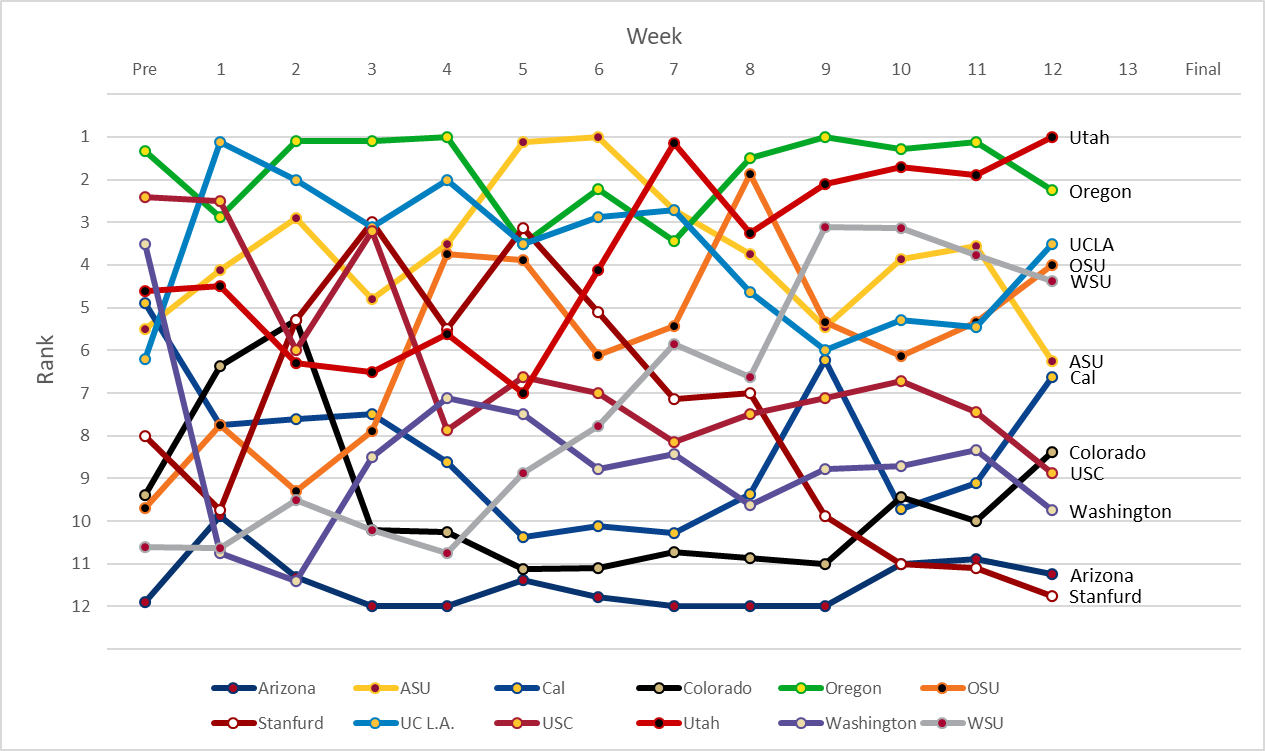 First things first—this week continues my new favorite obsession in these graphs, which is six consecutive weeks of a clear divide between the top and bottom halves of the conference (for which we thank USC and their pitiful performance against UCLA as a win by the former most certainly would have destroyed this balance). Beyond that, the changes this week make for some weird art—beautiful chaos, if you will. At both extremes of the conference, the two best and worst teams have some continuity from last week. But the next four teams (so #3–6 and 7–10) have unique and symmetrical inversions. If only the Ducks could have beaten the Utes and this picture would have been absolutely insane.