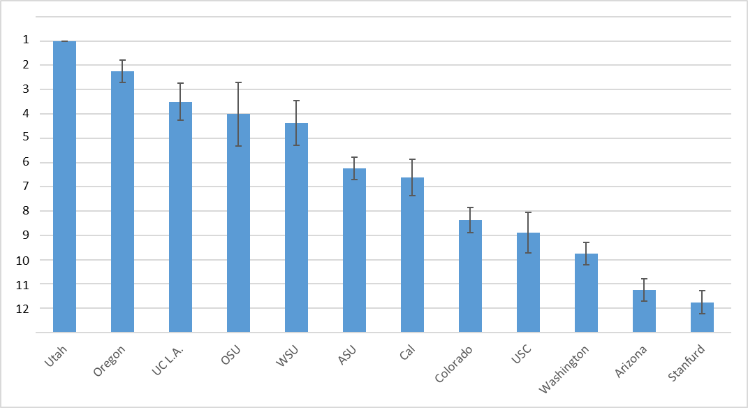 Compiling our individual votes (Table 1) actually yields a more detailed breakdown. A high-res version of our rankings is shown in Figure 3. The precise ranking for each team (obtained by taking the mathematical average of every response that a team received) is graped in the vertical columns; the error bars show you the standard deviation of the responses. A large standard deviation means there was a lot of variability—the Beavs have a large standard deviation because their individual votes varied from second to sixth.
