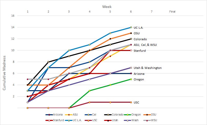 Next week, we’ll have the final set of in-conference games. Hopefully poor Colorado will be able to get into a game or they’ll get screwed by virtue of a second-place divisional finish. But to highlight some poor planning by virtue of the cross-divisional seeding, there are two South teams that need a win next week to meet/exceed 0.500 for bowl eligibility—UC L.A. (third in the South) and Utah (fourth in the South). UC L.A. seemingly has a tougher draw against 3–2 Stanfurd while Utah gets a potentially easier draw of 1–2 Washington State. Not that bowl season—or this season at all—really matters, but facepalms all around if Larry Scott et al.’s decisions to seed next week and keep 0.500 benchmark for eligibility come together to send worse teams as our bowl representatives.