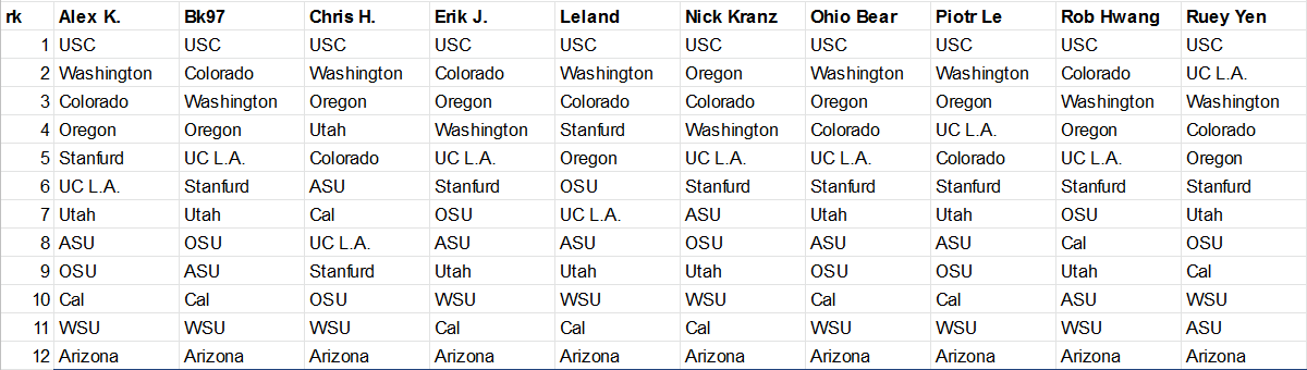 Nick Kranz (2): This is probably more of a protest vote against UW getting into the conference title game with a 1–1 North record, but Oregon does actually have two convincing North wins, a solid win over UCLA, and two pretty unlucky losses. I think a second-place ranking can be justified.