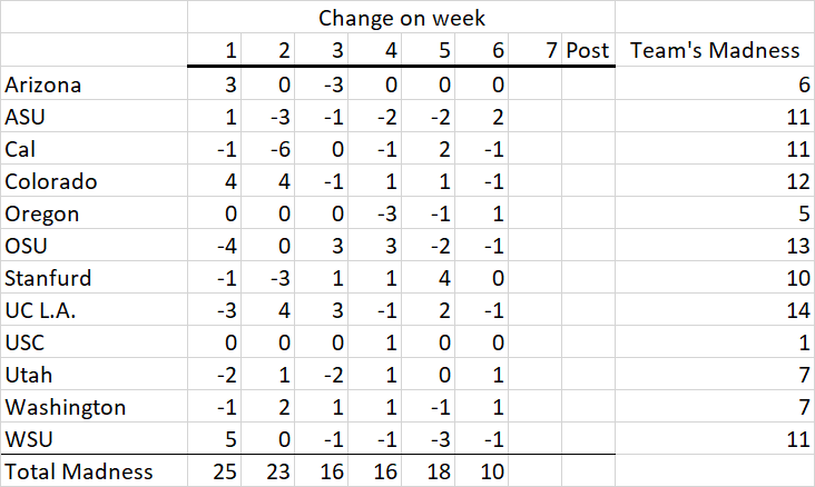 Not much movement this week compared to the last—the biggest shift belonged to Arizona State, which could only muster up two spots despite obliterating their archrivals. All that stability resulted in 2020’s quietest week in terms of Madness (Fig. 2a), which is simply a measurement of how much the teams moved up and down our rankings.