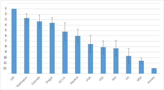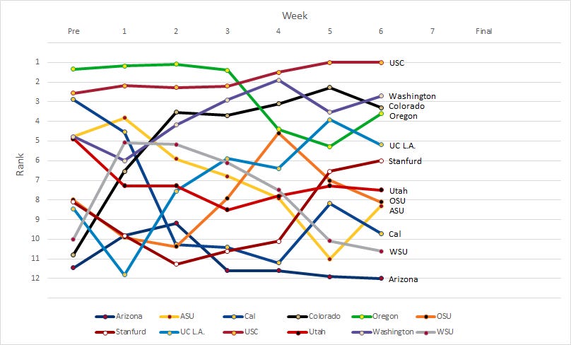 An alternative presentation of this rankings—along with the season-long precise rankings—is shown in Figure 4. As the lone undefeated team in the conference (and one that managed to play five of six games), USC stands alone head and shoulders above the rest of the conference. One interesting detail in the precise scores that’s lost in the rounded ranks is that Stanfurd would appear to have idled after their win over Oregon State, but their precise score actually did increase to reflect the win (Fig. 4).