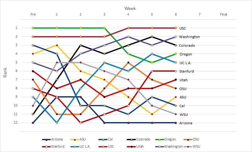 Christopher_h: I originally thought I’d ignore game results and just rank teams according to who I thought would be the favorite, but then it resulted in some kind of unfair rankings where teams that outperformed expectations (Colorado, OSU) were still sitting near the bottom. Expectations are what determine odds—and yet I disagree with odds all the time (and hence, sports betting was born). The top three according to oddsmakers are USC, Oregon, and Washington, then there’s a giant cluster nearly interchangeable in the middle (Stanford, Cal, Utah, ASU, UCLA), and then Colorado, OSU, Wazzu, and finally Arizona. Remember, Colorado was an 11.5-point underdog to UCLA—whom they ended up beating—so it’s a bit unfair to stick strictly to odds as pretty much everyone has Colorado above UCLA. So instead I started with that and moved teams up and down a little bit from there.
