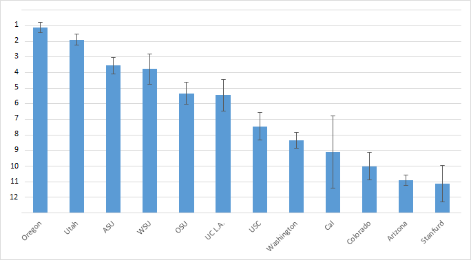 Our most accurate of rankings—the precise value that was obtained when calculating the averages of our votes—is shown in Figure 3. The error bars represent standard deviation, where a large standard deviation means we were rife with disagreement. California’s error bar is as long as Twist’s chest hair—three of us ranked the team at the bottom for low morale despite technically still being in the hunt for bowl eligibility while the team received homer votes as high as sixth that ranked us above teams that have already booked their ticket for postseason action.