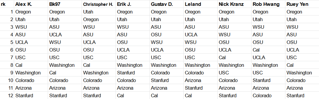 Alas—the upheaval among the Cal football program and fans was not enough to tank the Bears completely to twelfth place. But there was a number of voters who felt as such and voted accordingly. The full list of votes is collected in Table 1.