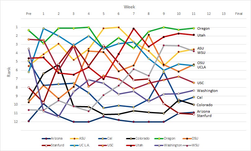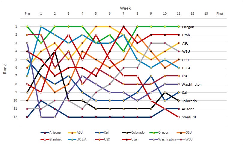 The precise ranks for the year are graphed in Figure 4. I find the most interesting takeaway from this week’s precise ranks is the trio of near ties—ASU & WSU, OSU & UCLA, and Arizona & Stanfurd. Though the Power Rankings are not a simple ranking of which team is better on-field, it’s worth noting that only one of these doublets has faced off this year—a big Cougs win over the Sun Devils, 34–21.