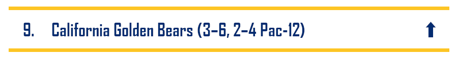 Berkelium97 (9): An unscheduled bye week was a blessing for a Cal team in desperate need of the return of some key players. Now that the Bears are getting healthy again, they have a good chance to climb in my ballot over the next few weeks.