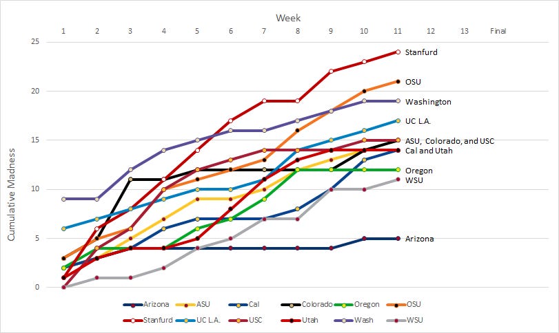 The cumulative Madness for each team is shown in Table 2 and also graphed in Figure 2. Arizona has been the most consistent team of the year, as exemplified by their low Madness score—they have half the Madness as the next team (Wazzu). Stanfurd continues to extend their lead (3 points) as the Maddest team; since they literally can’t go any lower in the rankings, the only way for them to continue building on this lead is by winning games and moving up. Gulp.