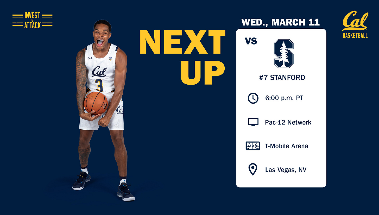 Cal will begin the Pac-12 tournament against 7 seed Stanford, and the winner will play 2 seed UCLA. Meanwhile, Stanford and UCLA are both right on the razor’s edge of the bubble. As of Monday night The Bracket Matrix has Stanford as the 3rd to last team IN, while UCLA is the first team OUT.