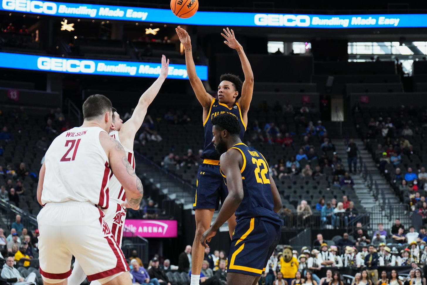 Kuany Kuany has a nice spurt, and scores 6 points in the last 2 minutes of the half. Cal also give up a couple of open 3-pointers to WSU’s Jabe Mullins. WSU leads 35-21 at the half.