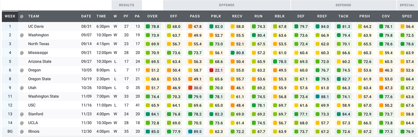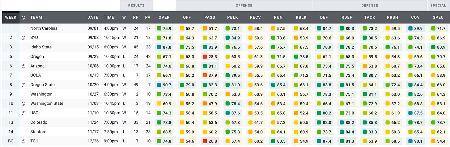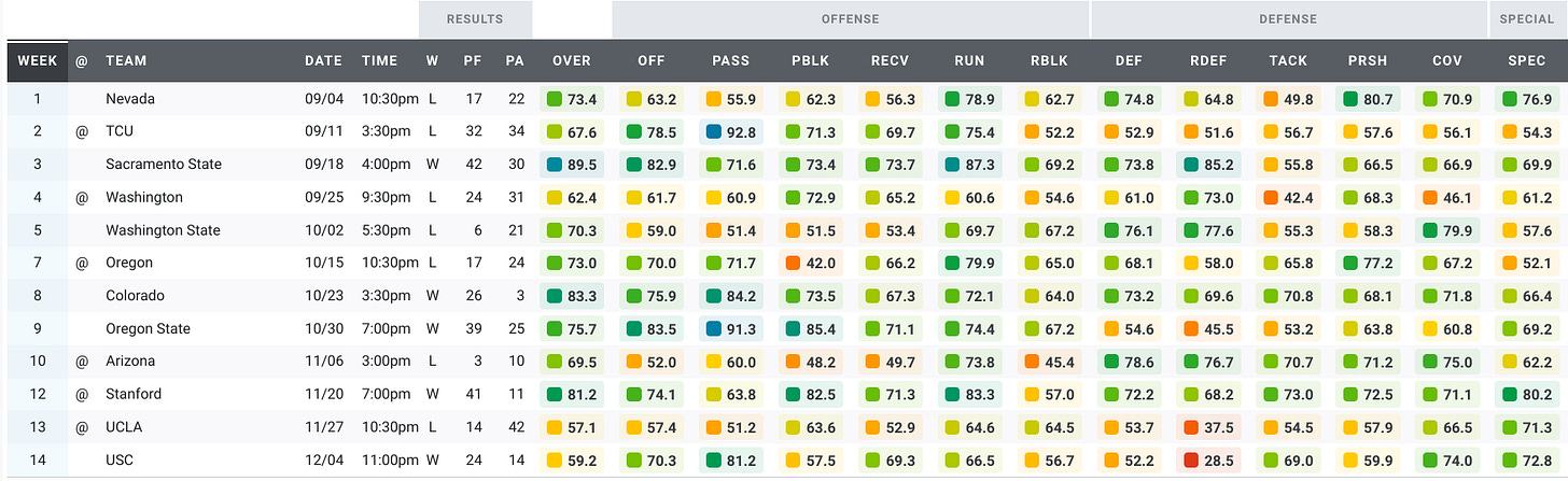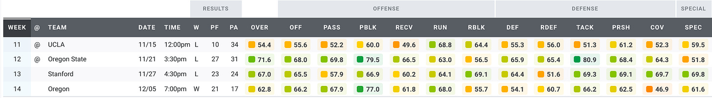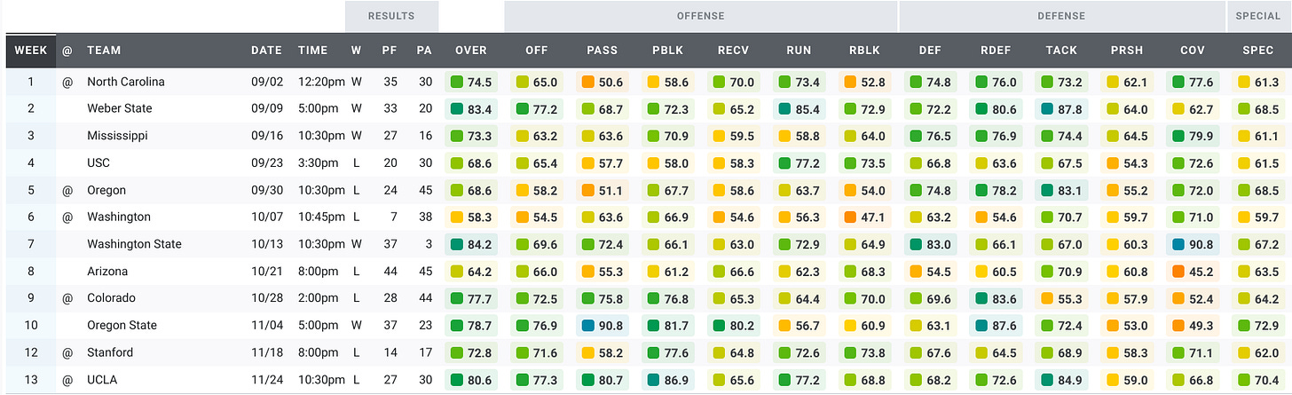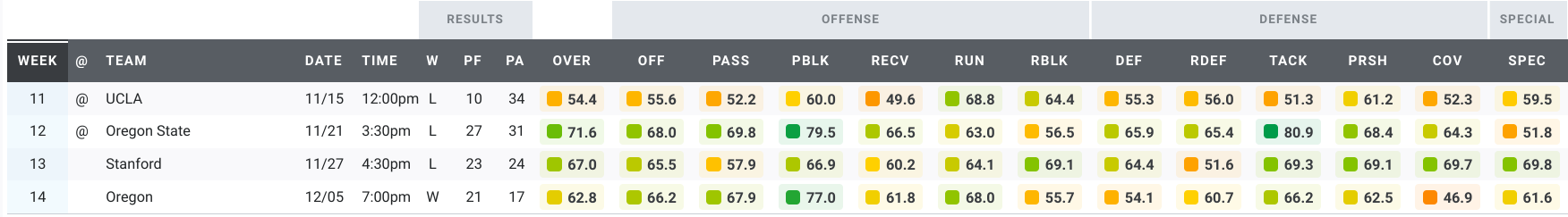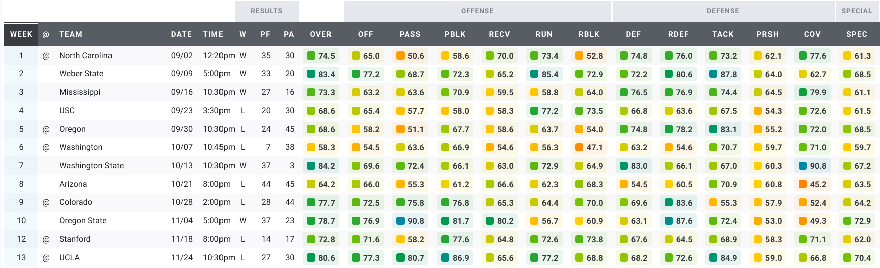 Strong and Balanced: 2019 vs. Illinois (W, 35-20), 2021 vs. Colorado (W, 26-3) 2017 at UCLA (L, 27-30). In each of these games every category scores well in the 60s, 70s, or 80s.