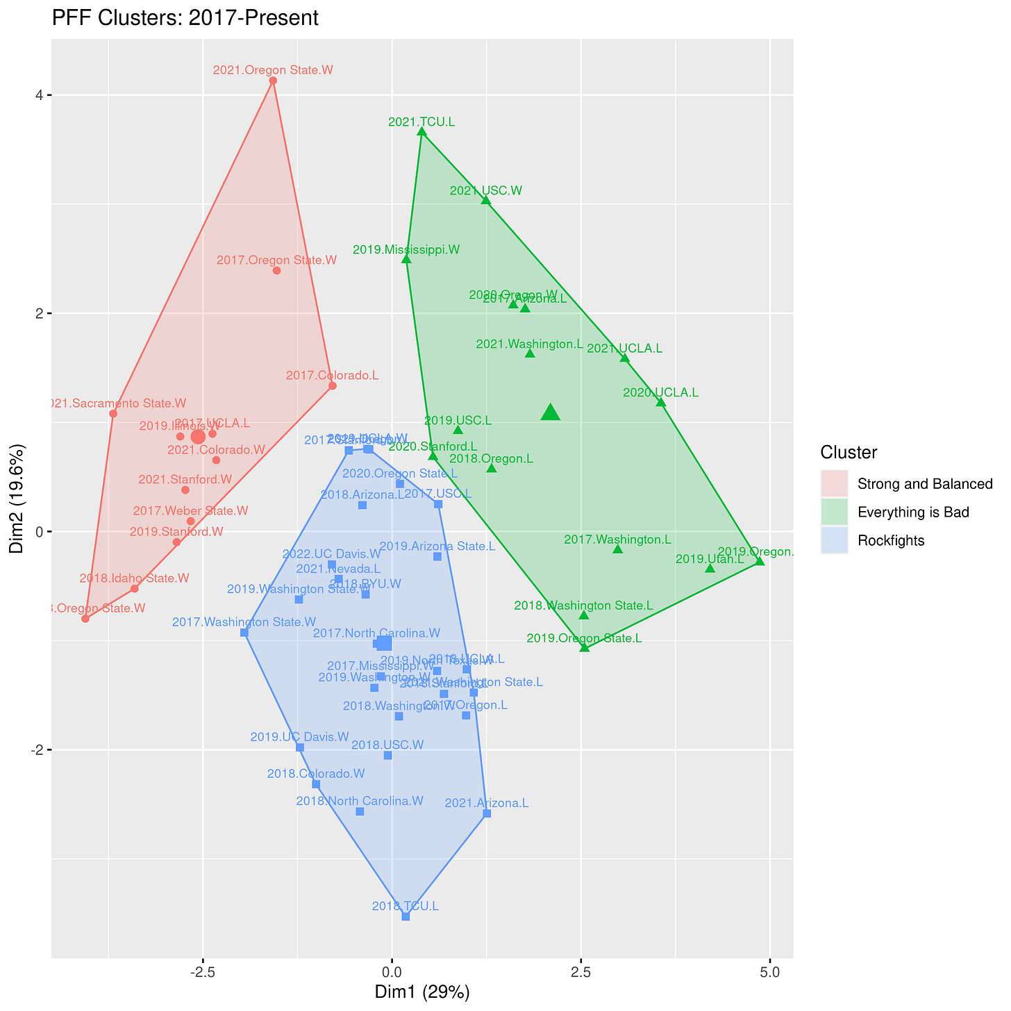 Membership in these clusters extends beyond the typical games, however. The Rockfight cluster, for example, has several games you’d probably expect to be all-defense, no offense rockfights: the 2019 Lightning Bowl at Washington, the Cheez It Bowl, and the 15-14 win over USC in 2018. But it also has some games that aren’t low-scoring, defensive struggles: the 33-20 win over Wazzu in 2019, the 33-21 win over Colorado in 2018, and the 37-3 blowout win over Wazzu in 2017. So there is indeed some variation within each category.