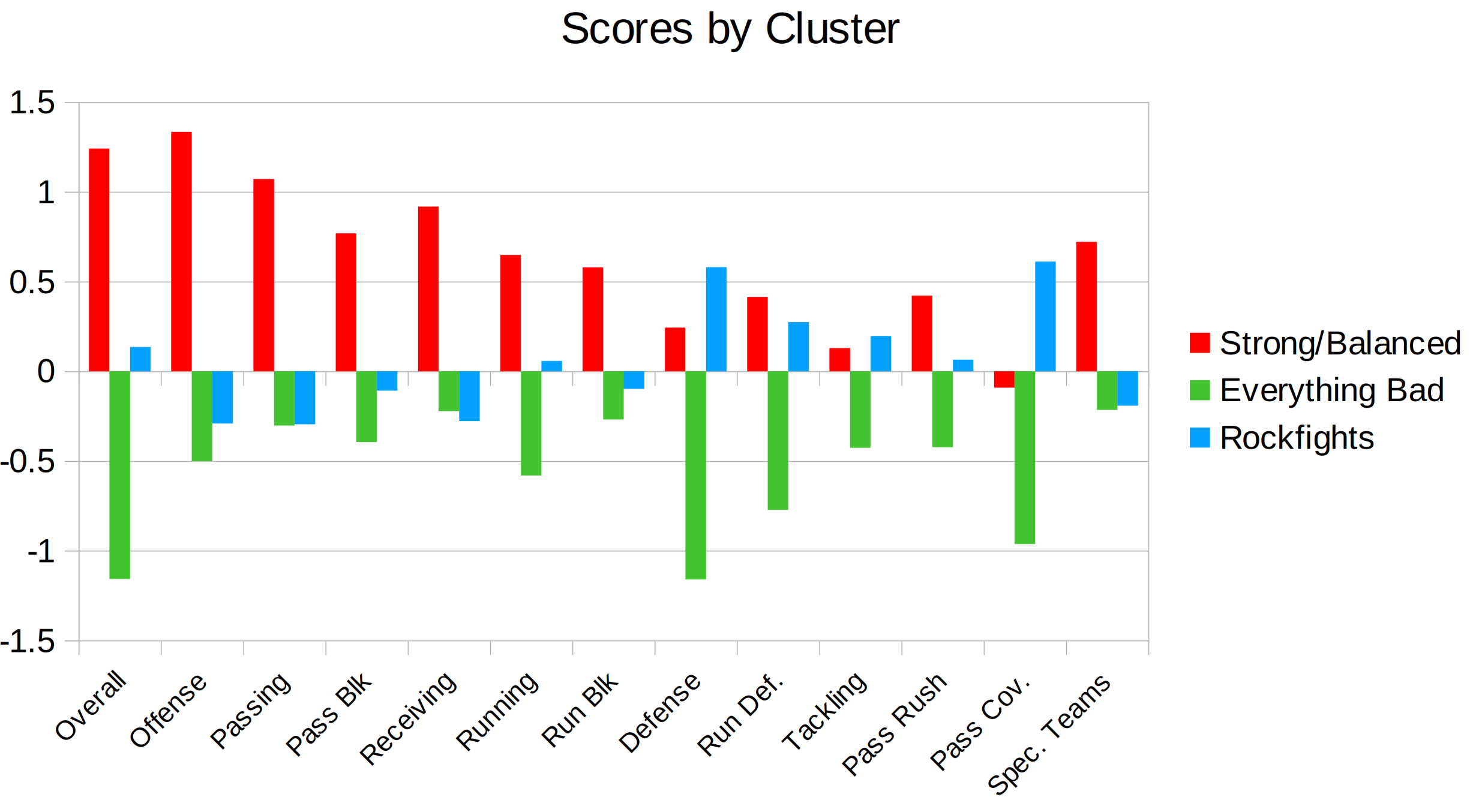 There’s only one cluster where the offense performs well: the Strong and Balanced cluster. Not only does offense score well, but every single category of offense is vastly better than in the other cluster. Nearly every aspect of offense scores poorly in the Rockfight cluster and those grades are typically even worse in the Everything is Bad cluster. Defense performs well in the Rockfight cluster and the Strong and Balanced cluster, although defense tends to be a little bit better in Rockfights. This is especially true for pass coverage; lockdown pass defense seems to be a key ingredient for a rockfight. Unsurprisingly, everything is bad in the Everything is Bad cluster: offense, defense special teams—all of it scores poorly, often by large margins compared to the other clusters.