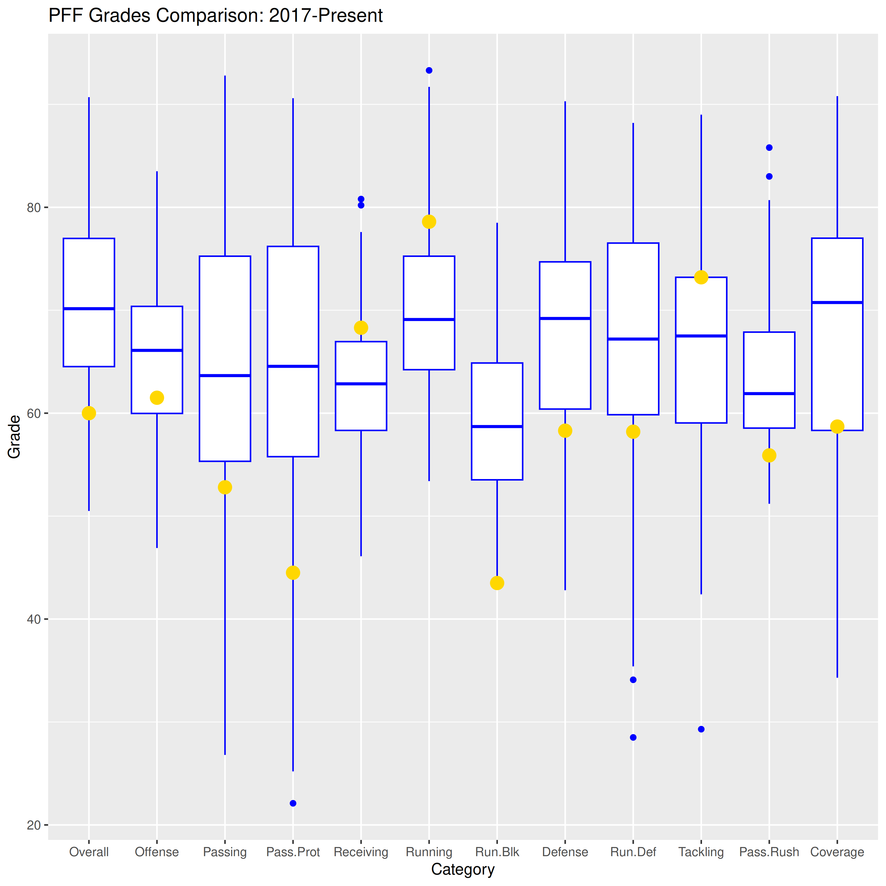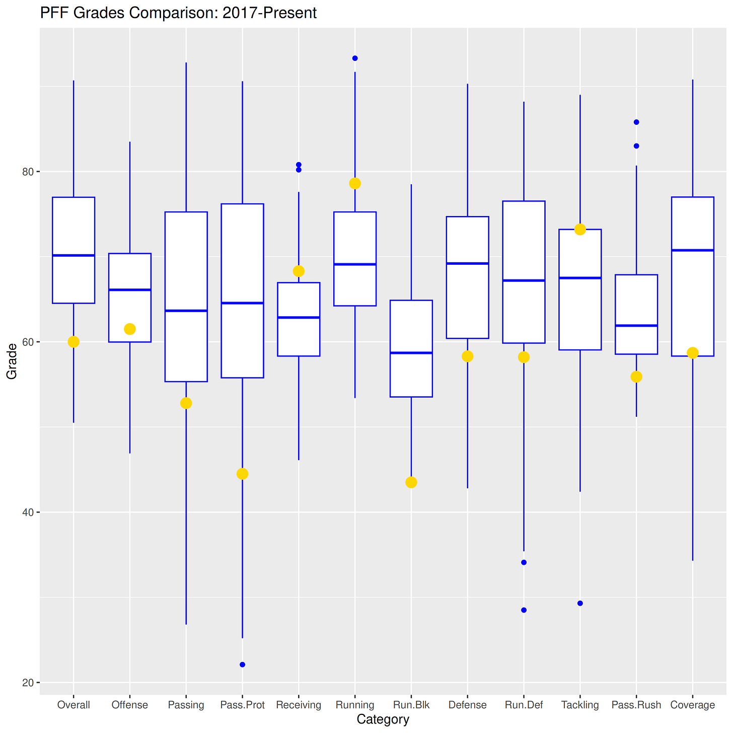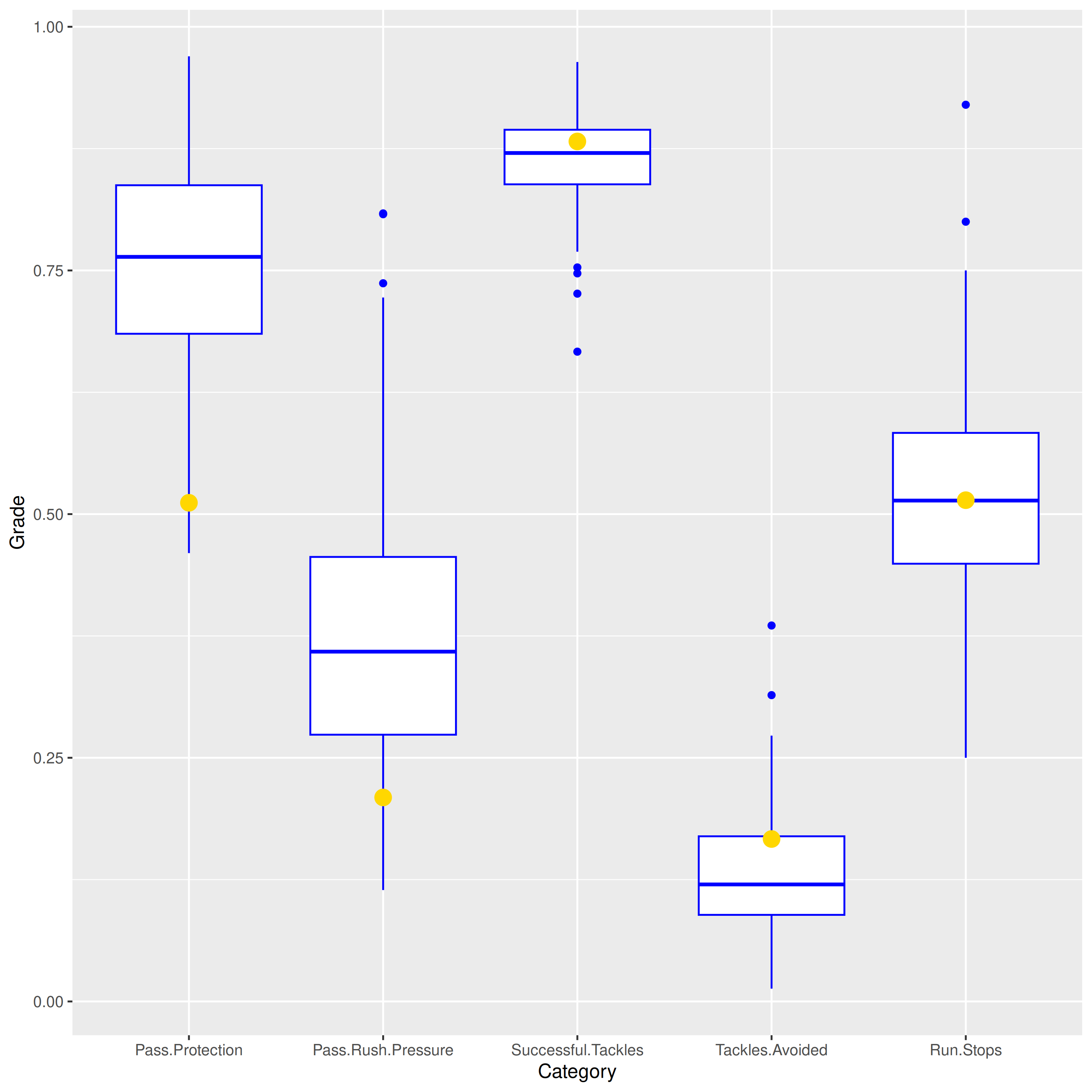 Generally anything below the box is bad because it’s a grade in the bottom 25% of all grades previously recorded under Wilcox. 8 of our 12 categories fall into that threshold, and run blocking set a new record for lowest score. Only 3 categories fared better than usual: receiving, running, and tackling, all of which finished in the top 25%, oddly enough. However, it’s hard to expect much from the RBs and receivers when the line can’t run block or protect the QB. So the offense featured some great individual efforts while everything else was mostly broken. Likewise, the tackling was good, but it’s hard to be too pleased with good tackling after the QB slings another 20-yard bomb or a RB breaks off a 30-yard scamper. And with all the other defensive categories falling below the 25th percentile, that was a consistent outcome: good tackling cleaning up the mess left by an otherwise broken defense.