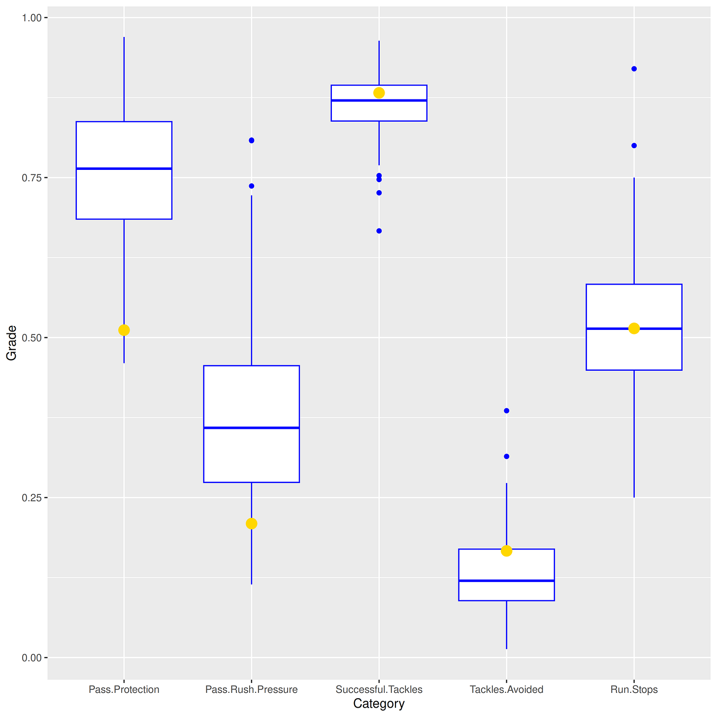 Our friends at Pro Football Focus undertook their typical herculean feat by grading every player on every snap and then aggregating those grades into team-level grades. We will then use those team-level grades to figure out what kind of game this one was. First, the raw grades: