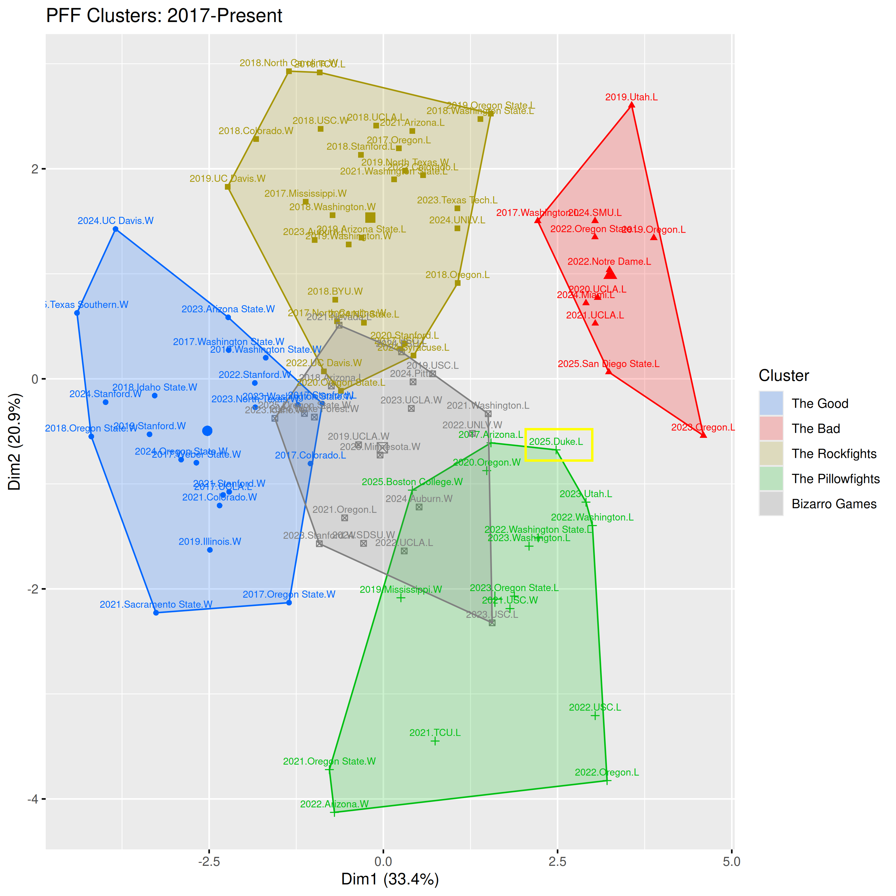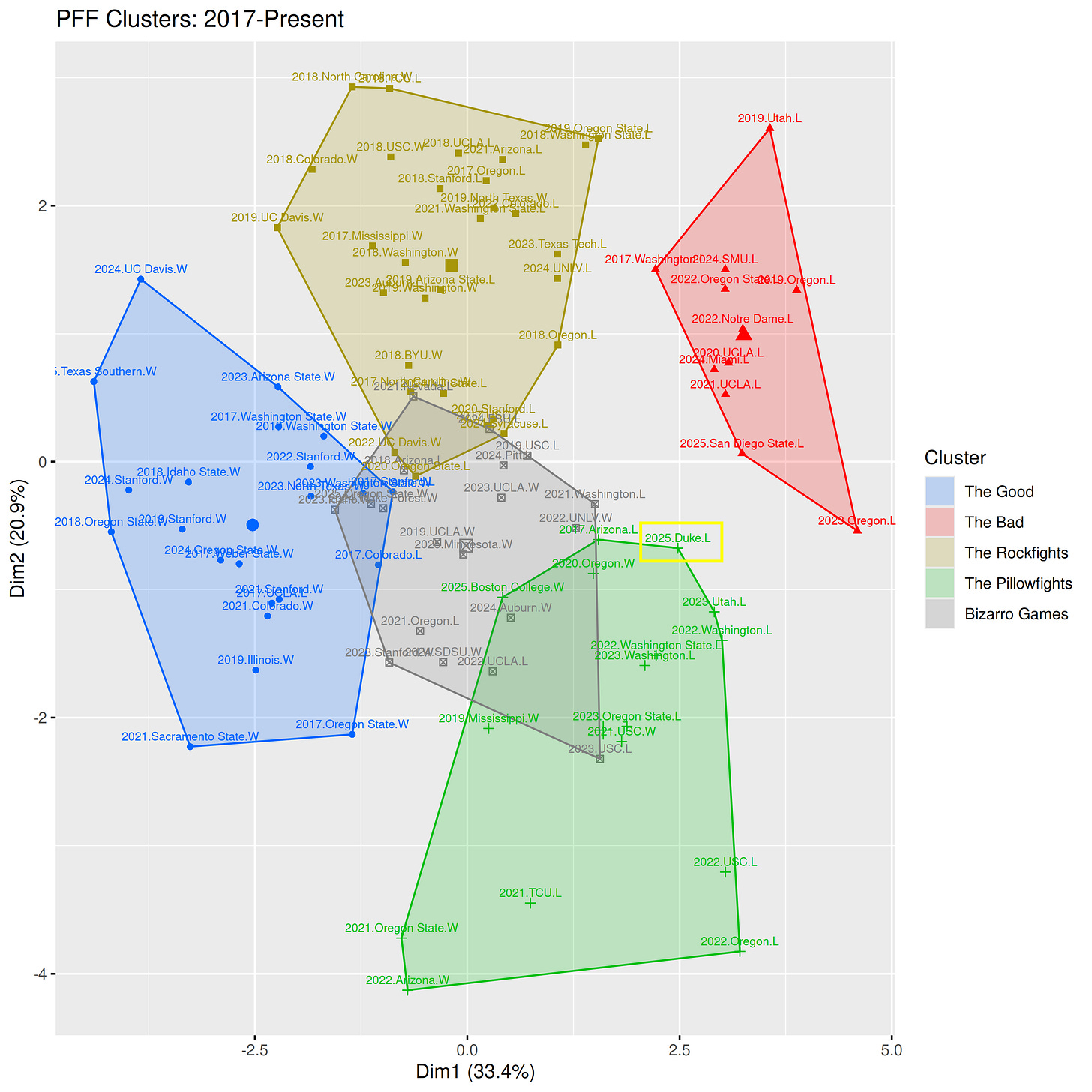 Pillowfight! Sure, it’s the closest Pillowfight to the border of The Bad, but this one made the cut. Interestingly, PFF bumped up several of the grades from the Boston College game and that one migrated from Bizarro Games to Pillowfights. Pillowfights were more common from 2021-2023, but we have not seen any in a while (last week’s BC revision notwithstanding). Pillowfights tend to be oddball games where the defense can’t do anything right and the offense tends to have some success despite O-line struggles. That certainly fits Saturday’s script, although the offense was successful for about 20 minutes until the Blue Devils started filling their pillows with bricks.