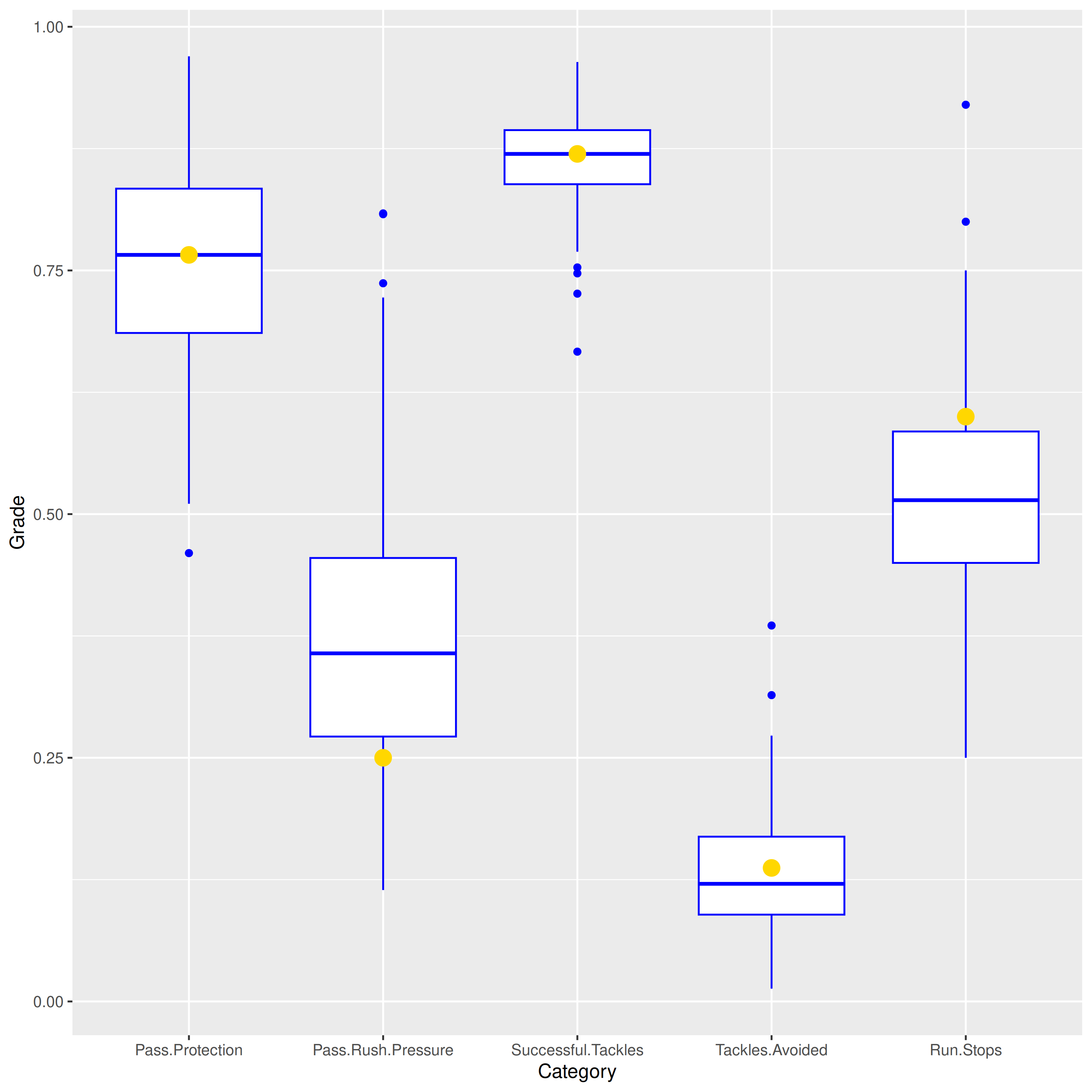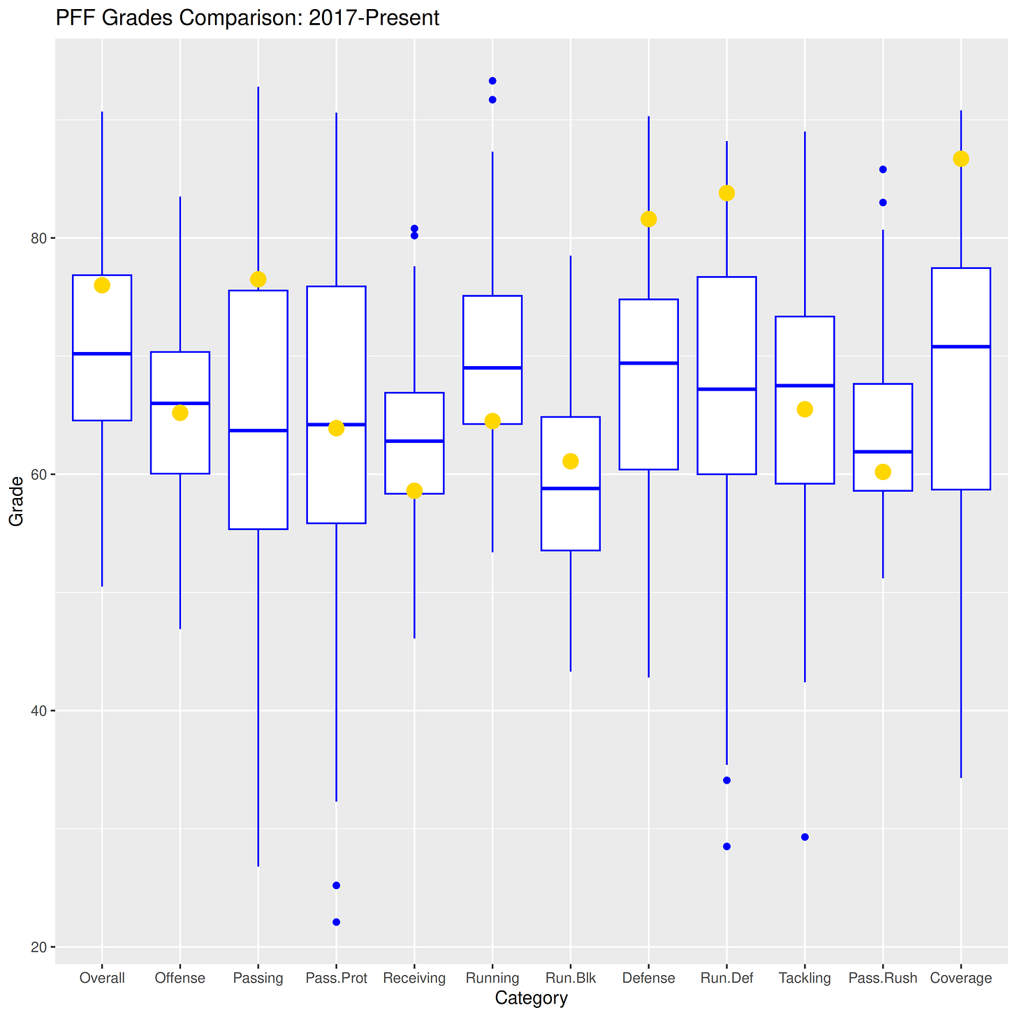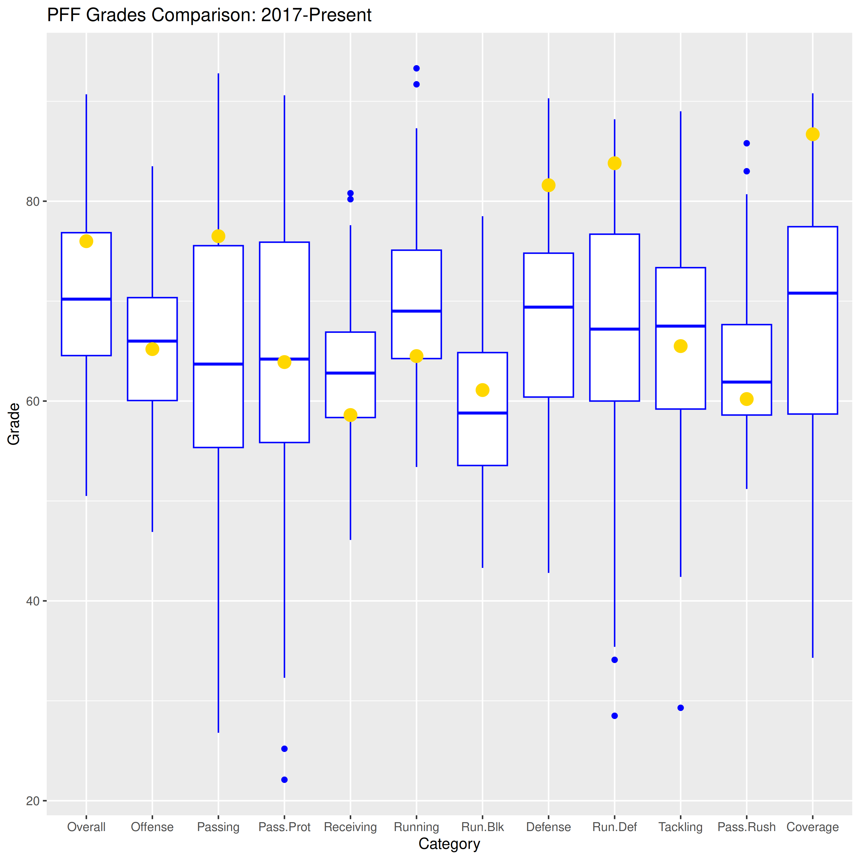 The grades show an unusual pattern of inconsistency in the team’s performance. Any of the grades above or below the box are in the top 25th or bottom 25th percentiles, respectively. Half the grades are in those top or bottom sections, and Overall is on the precipice of being in the top 25th percentile. So, many things went very right and many went very wrong on Friday. It was a mixed affair for the offense: Passing was great but let down by poor Receiving (SO. MANY. DROPS.). Run blocking was better than usual, while running was much worse than usual. Pass protection was perfectly average, and it all combined into a slightly below average grade for Offense. Defensively, things were generally better. Run Defense and Coverage were exceptional, although Tackling and Pass Rush were slightly worse than usual. No matter, as overall Defense earned a strong grade.
