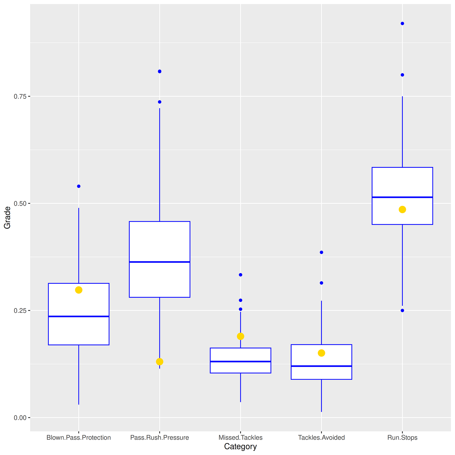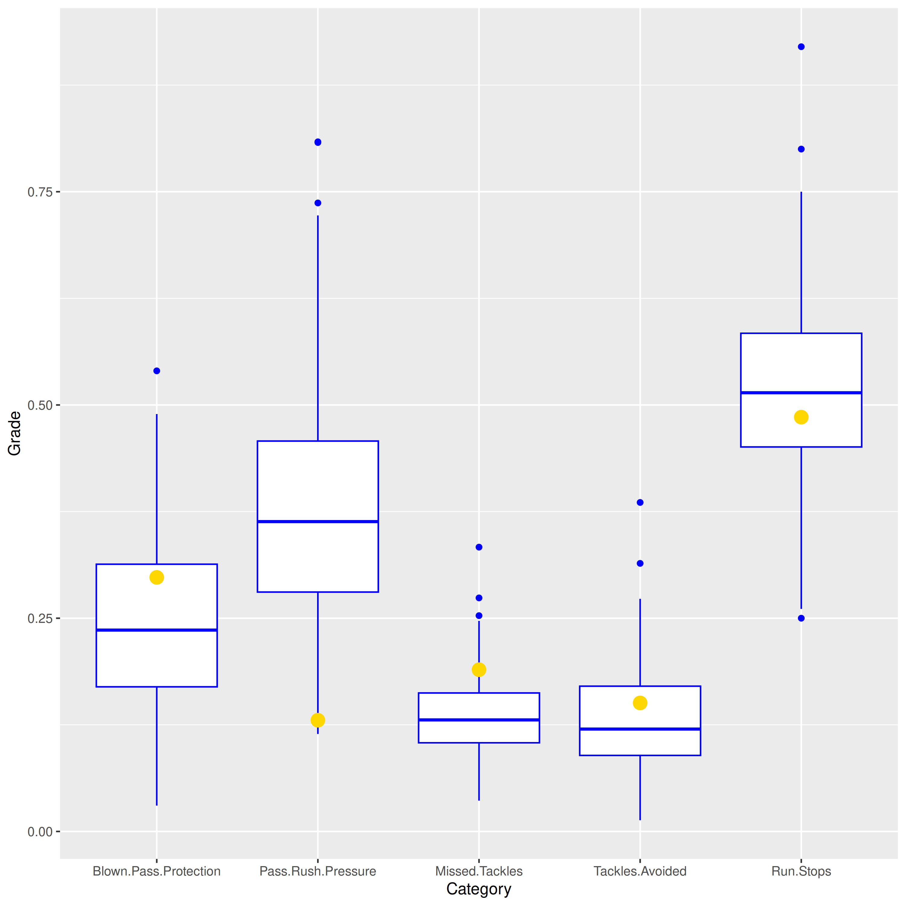 Not good! Data points below the box are in the bottom 25% of all previous grades, and data points below the horizontal line within the box are in the bottom 50%. As you can see, we have plenty of bottom-25% grades out there. Again, not good.