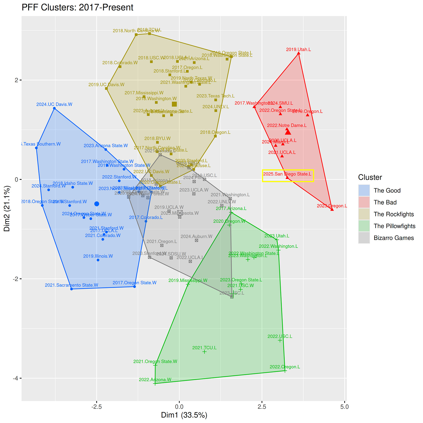 Of course we do! If you thought this would end up anywhere but The Bad, you need to get your eyes checked. The plot above clusters similarly graded games together, and this one fell somewhere between the 14-42 loss to UCLA in 2021 and the 19-63 loss to Oregon in 2023. Great company, those games.