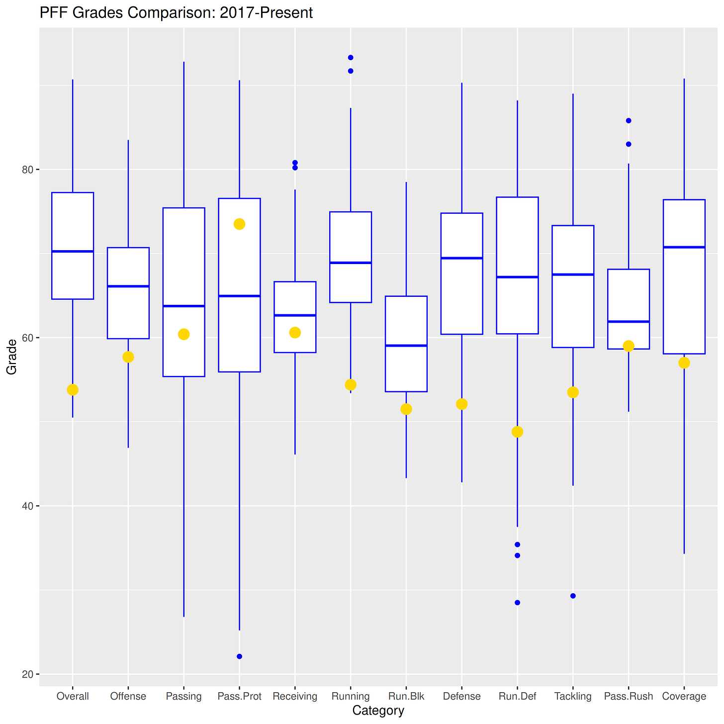 PFF’s graders evaluated every single player on every single play, and then aggregated those grades to team-level grades. We highlight those grades below in comparison to all previous grades from the Wilcox Era.