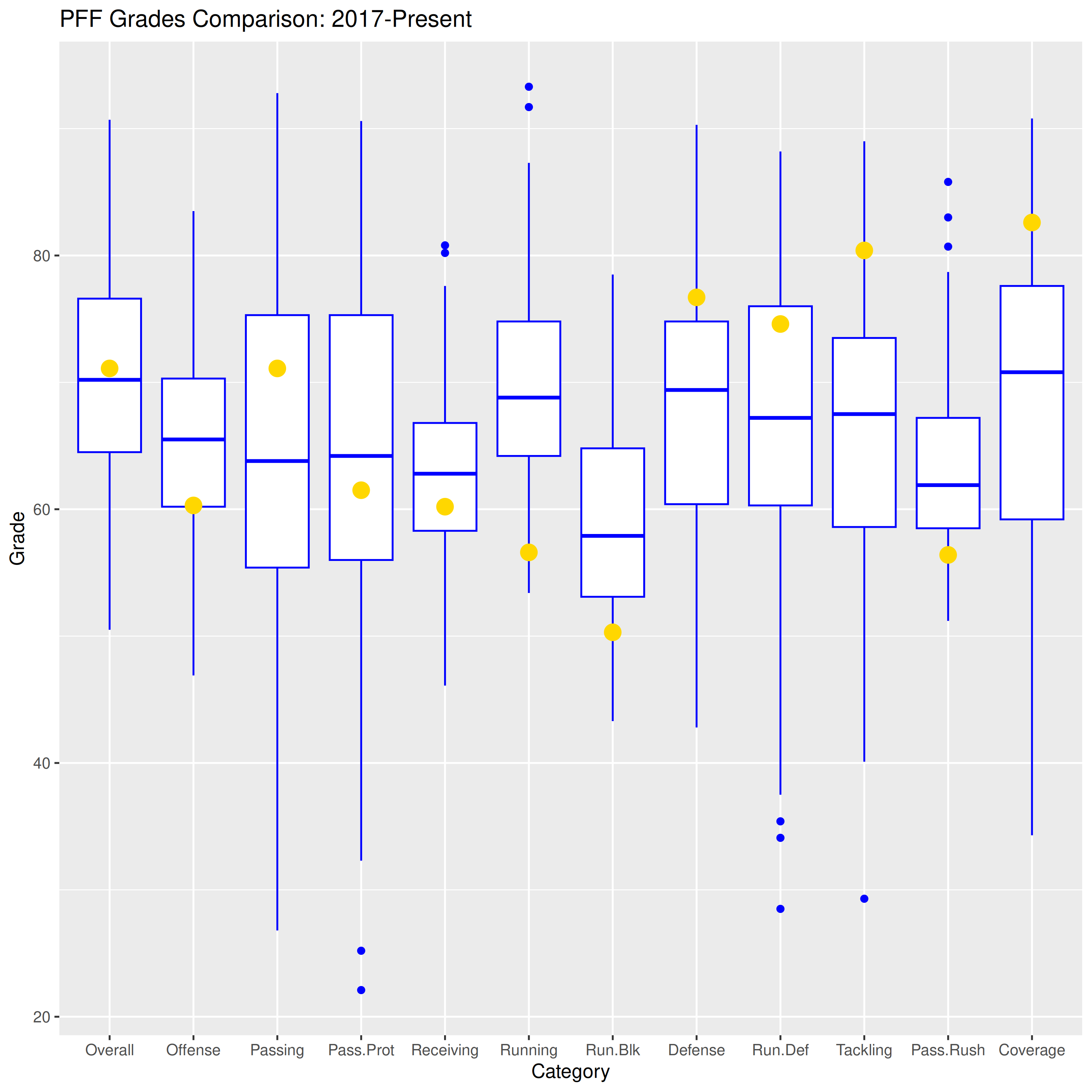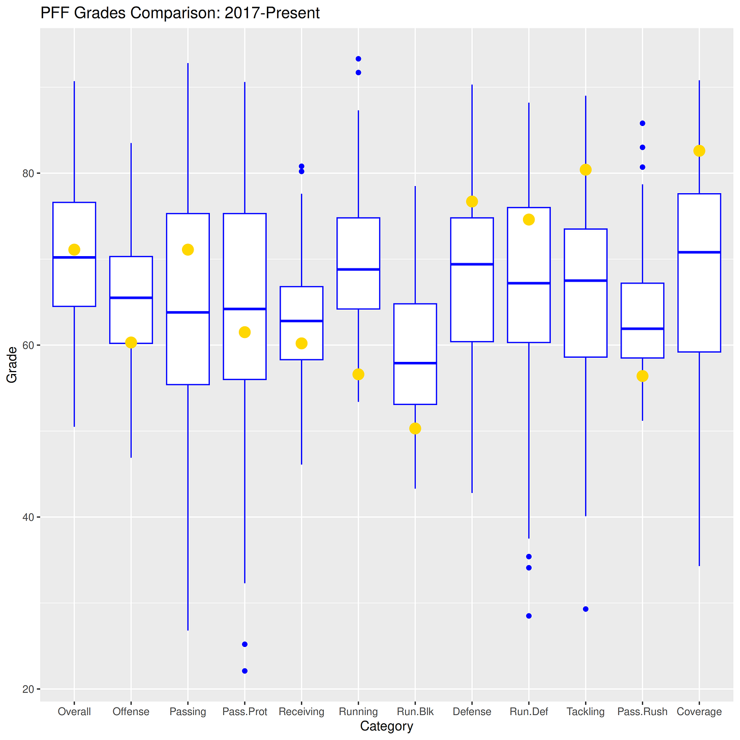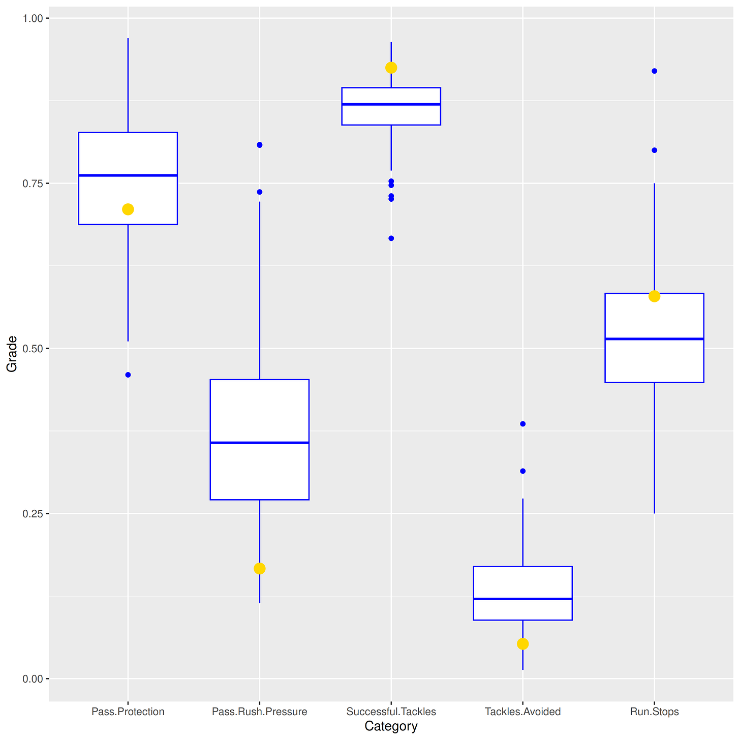 Anything above the box is a top 25% performance and anything below the box is a bottom 25% performance; 7 (almost 8) of the categories were outside the box, so this one had some strong grades. Unfortunately for the offense, all those outside-the-box grades were negative. Running and Run Blocking received awful grades while Pass Protection and Receiving’s sub-par grades could not offset Passing’s strong grade. As a result, the Offense grade was right at the 25th percentile.